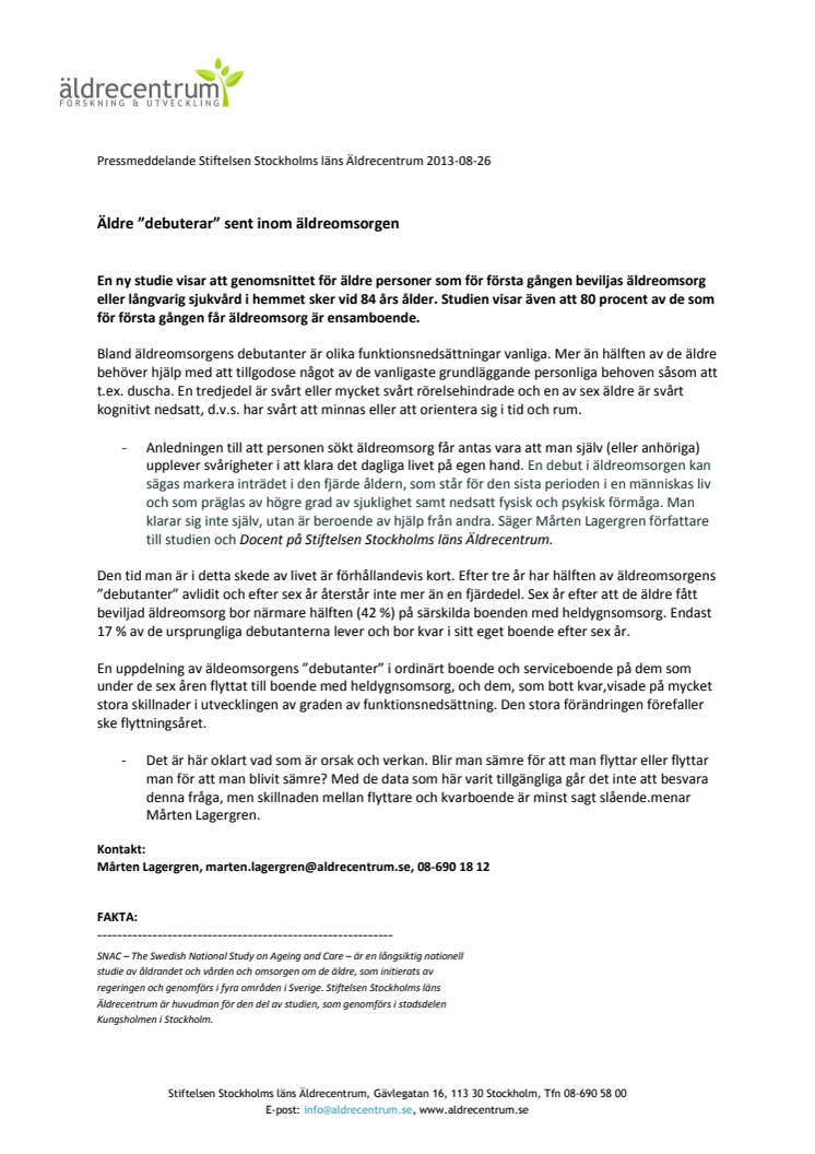 En ny studie visar att genomsnittet för äldre personer som för första gången beviljas äldreomsorg eller långvarig sjukvård i hemmet sker vid 84 års ålder. Studien visar även att 80 procent av de som för första gången får äldreomsorg är ensamboende.