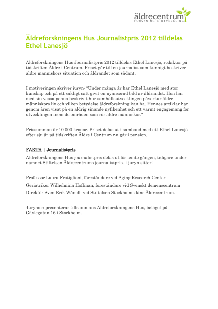 Äldreforskningens Hus Journalistpris 2012 tilldelas Ethel Lanesjö, redaktör på tidskriften Äldre i Centrum. Priset går till en journalist som kunnigt beskriver äldre människors situation och åldrandet som sådant.Äldreforskningens Hus journalistpris delas ut för femte gången och prissumman är 10 000 kronor.