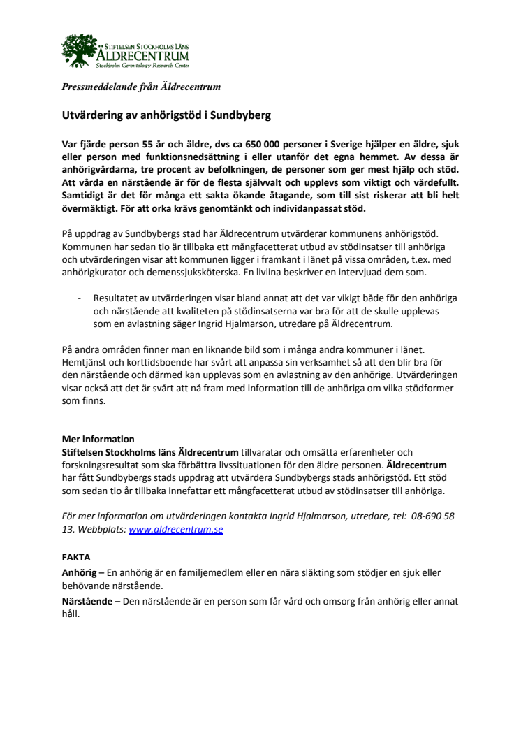 Var fjärde person 55 år och äldre, dvs ca 650 000 personer i Sverige hjälper en äldre, sjuk eller person med funktionsnedsättning i eller utanför det egna hemmet. Av dessa är anhörigvårdarna, tre procent av befolkningen, de personer som ger mest hjälp och stöd. Utvärderingen av Sundbybergs anhörigstöd visar att det är svårt att nå fram med information till de anhöriga om vilka stödformer som finns