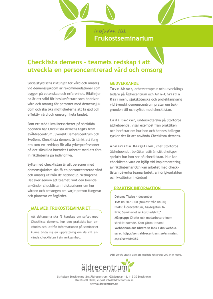 Tillsammans med Svenskt Demenscentrum och SveDem har Äldrecentrum tagit fram en checklista som är tänkt att vara ett stöd för personal som arbetar i särskilt boende. Checklistan bygger på Socialstyrelsens nationella riktlinjer och syftar till att sätta fokus på persocentrerad omvårdnad.