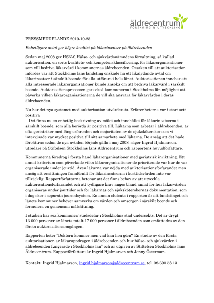 Sedan maj 2008 ger HSN-f, Hälso- och sjukvårdsnämndens förvaltning, så kallad auktorisation, en sorts kvalitets- och kompetensklassificering, för läkarorganisationer som vill bedriva läkarvård i kommunernas äldreboenden. Nu har det nya systemet med auktorisation utvärderats. Erfarenheterna var i stort sett positiva.