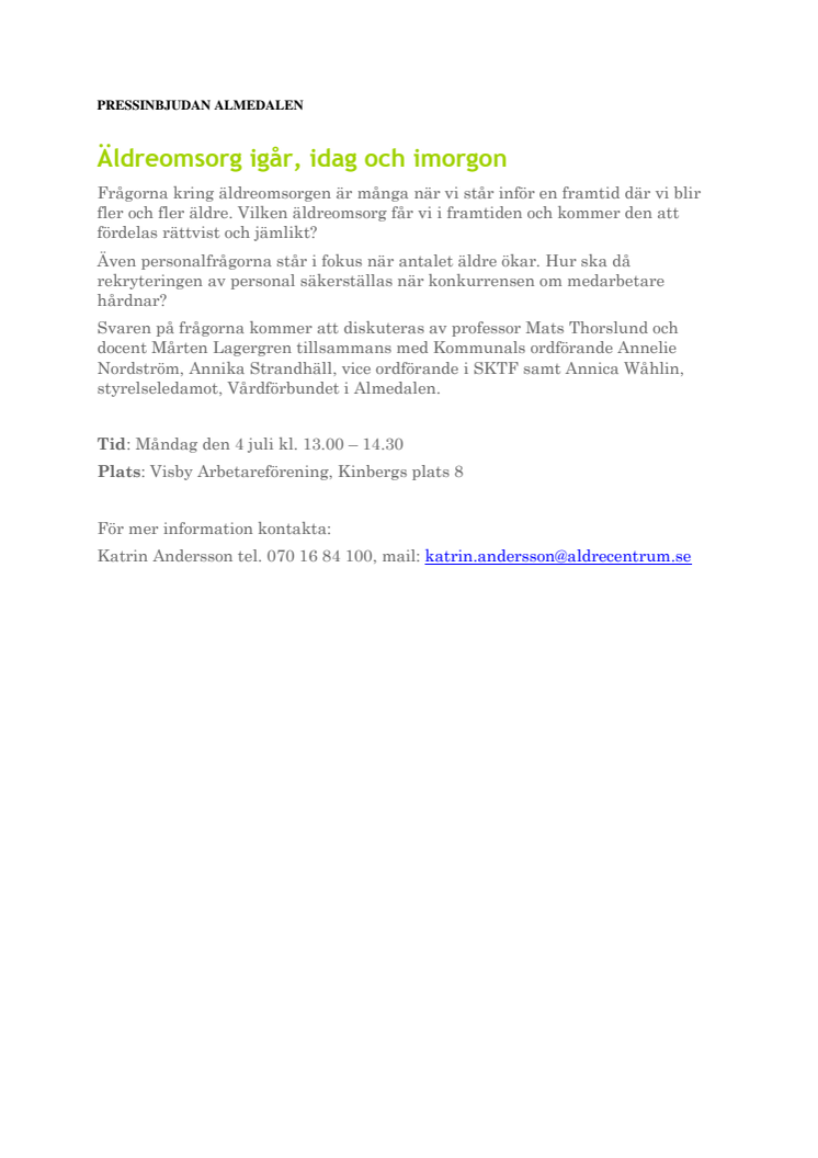Pressinbjudan Almedalen: Äldreomsorg igår, idag och imorgon