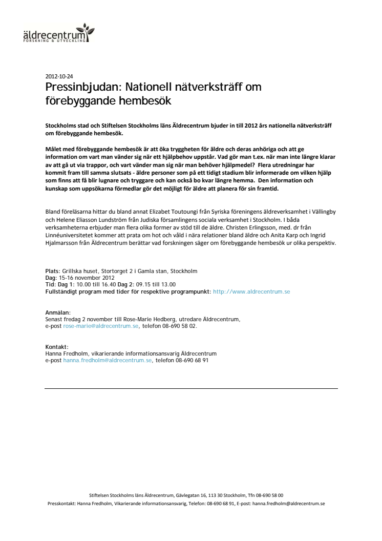 Stockholms stad och Stiftelsen Stockholms läns Äldrecentrum bjuder in till 2012 års nationella nätverksträff om förebyggande hembesök 15-16 november.