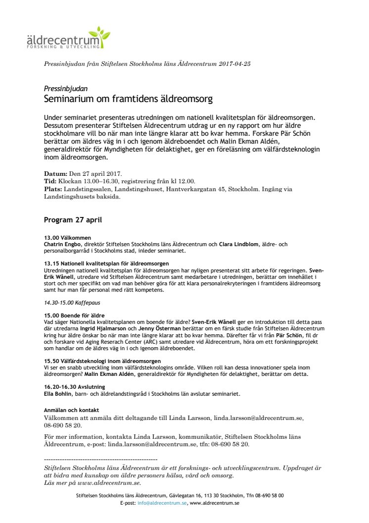 Under seminariet presenteras utredningen om nationell kvalitetsplan för äldreomsorgen. Dessutom presenterar Stiftelsen Äldrecentrum utdrag ur en ny rapport om hur äldre stockholmare vill bo när man inte längre klarar att bo kvar hemma. Forskare Pär Schön berättar om äldres väg in i och igenom äldreboendet och Malin Ekman Aldén ger en föreläsning om välfärdsteknologin inom äldreomsorgen.