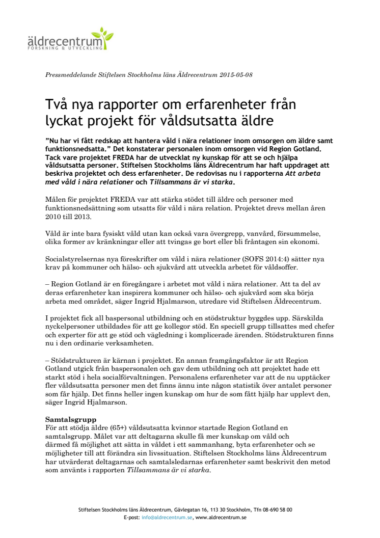 Två nya rapporter om erfarenheter från lyckat projekt för våldsutsatta äldre