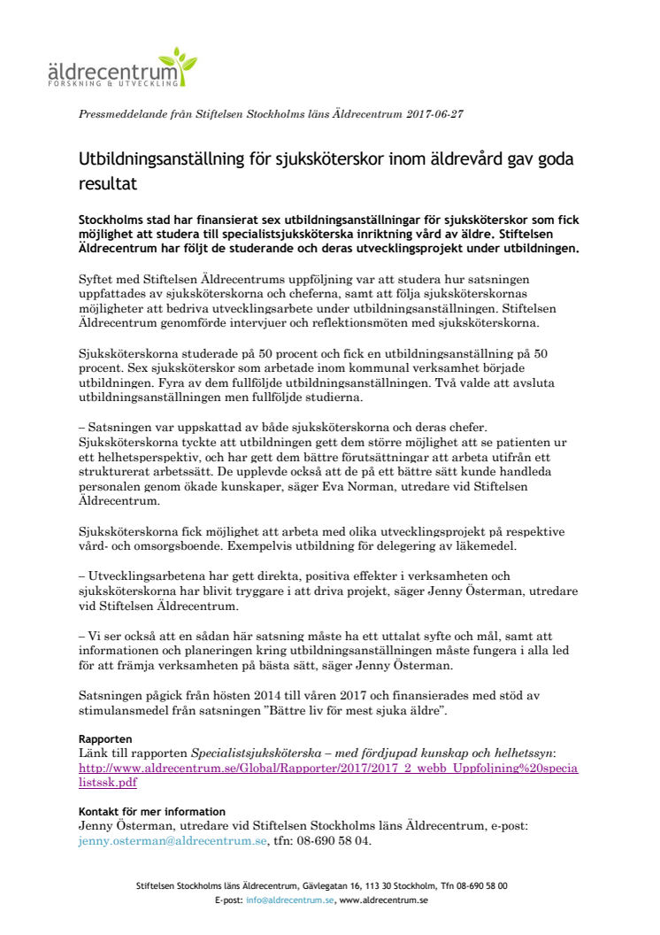 Stockholms stad har finansierat sex utbildningsanställningar för sjuksköterskor som fick möjlighet att studera till specialistsjuksköterska inriktning vård av äldre. Stiftelsen Äldrecentrum har följt de studerande och deras utvecklingsprojekt under utbildningen.