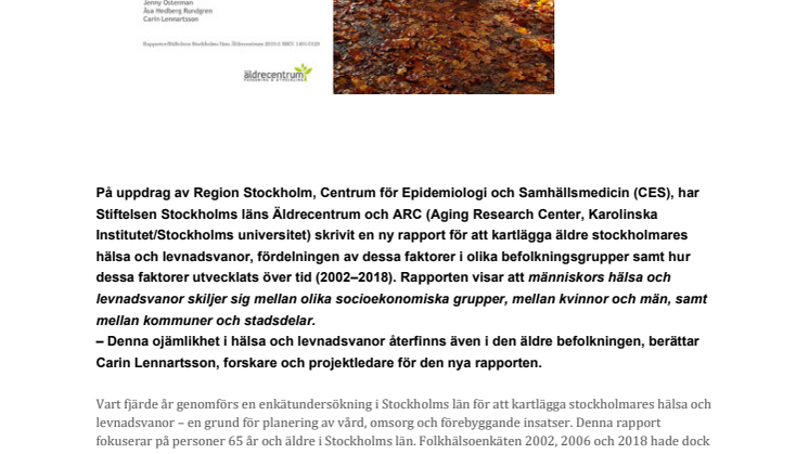 På uppdrag av Region Stockholm, Centrum för Epidemiologi och Samhällsmedicin (CES), har Stiftelsen Stockholms läns Äldrecentrum och ARC (Aging Research Center, Karolinska Institutet/Stockholms universitet) skrivit en ny rapport för att kartlägga äldre stockholmares hälsa och levnadsvanor, fördelningen av dessa faktorer i olika befolkningsgrupper samt hur dessa faktorer utvecklats över tid (2002–2018). Rapporten visar att människors hälsa och levnadsvanor skiljer sig mellan olika socioekonomiska grupper, mellan kvinnor och män, samt mellan kommuner och stadsdelar.