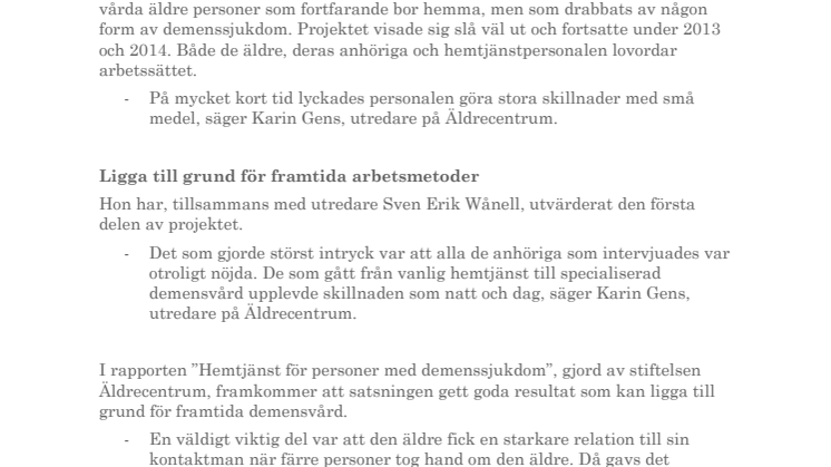 I rapporten ”Hemtjänst för personer med demenssjukdom”, gjord av stiftelsen Äldrecentrum, framkommer att satsningen gett goda resultat som kan ligga till grund för framtida demensvård.