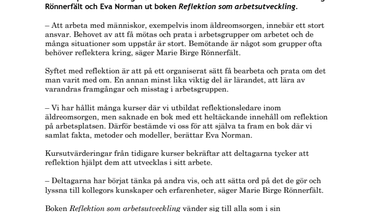 Att arbeta med människor innebär att möta många olika situationer. Genom att få reflektera tillsammans i arbetsgrupper utvecklas medarbetare i sina roller och i sin profession. Nu ger Stiftelsen Äldrecentrum och författarna Marie Birge Rönnerfält och Eva Norman ut boken Reflektion som arbetsutveckling.