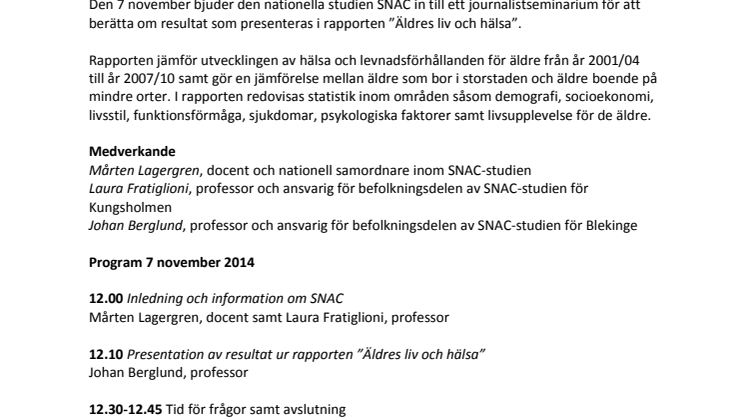 Kontakt: Mårten Lagergren, forskningsledare Stockholms läns Äldrecentrum och samordnare för SNAC-studien, marten.lagergren@aldrecentrum.se, tfn 08-690 5812.