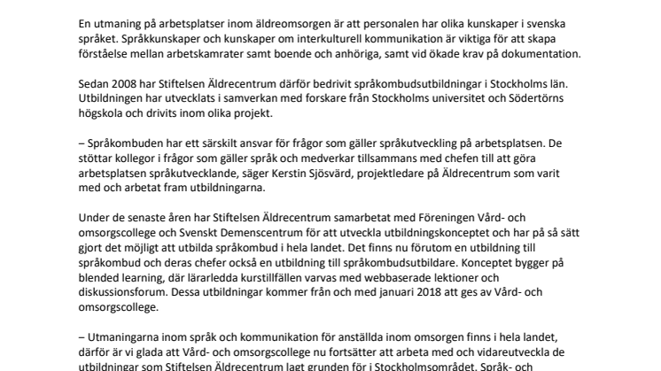 Sedan 2008 har Stiftelsen Äldrecentrum därför bedrivit språkombudsutbildningar i Stockholms län. Utbildningen har utvecklats i samverkan med forskare från Stockholms universitet och Södertörns högskola och drivits inom olika projekt.