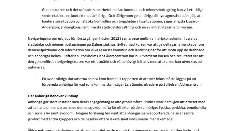 utvalda stadsdelar och minnesmottagningen på Dalens sjukhus. Syftet med kursen var att ge deltagarna kunskaper om demenssjukdomar och information om vilka resurser kommun och landsting har för att möta upp de drabbade och anhörigas behov. Stiftelsen Stockholms läns Äldrecentrum har nu utvärderat kursen och resultatet var att den genomförda navigeringskursen var ett utmärkt och välbehövligt initiativ men att kursen kan utvecklas och optimeras.