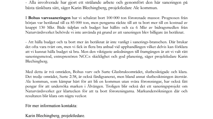 Med detta är två områden, Bohus varv och Surte Glasbruksområdet, slutbesiktigade och klara. Det tredje området, Surte 2:38, är också färdigsanerat, men bland annat slutbesiktningen återstår. Ale kommun, som kämpar hårt för att bli en kommun utan svåra föroreningar, har också fått pengar för att undersöka marken i Älvängen. Troligen blir också det ett saneringsprojekt om Naturvårdsverket ger klartecken för att ta bort föroreningarna. Markundersökningen där och resultaten blir klara om några veckor.