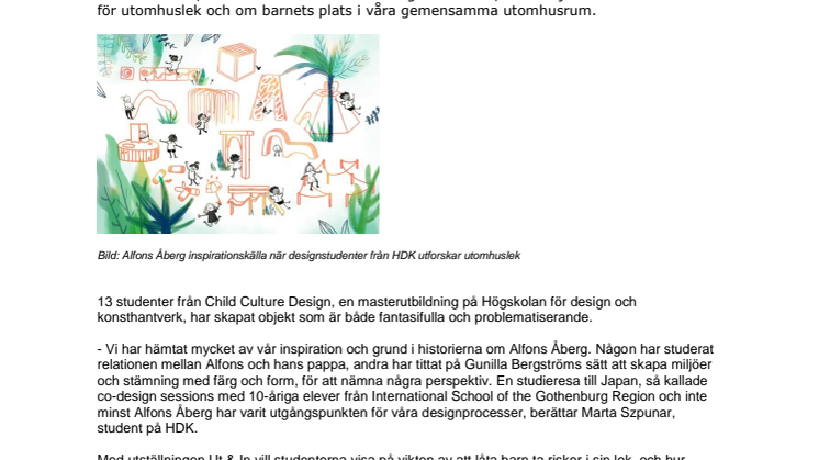 - Vi har hämtat mycket av vår inspiration och grund i historierna om Alfons Åberg. Någon har studerat relationen mellan Alfons och hans pappa, andra har tittat på Gunilla Bergströms sätt att skapa miljöer och stämning med färg och form, för att nämna några perspektiv. En studieresa till Japan, så kallade co-design sessions med 10-åriga elever från International School of the Gothenburg Region och inte minst Alfons Åberg har varit utgångspunkten för våra designprocesser, berättar Marta Szpunar, student på HDK.