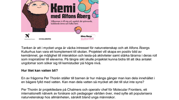 Hasselbladstiftelsen stödjer ett kemiprojekt på Alfons Åbergs Kulturhus som startar under hösten. Ett projekt som ska öka barns intresse och förståelse för kemi. Något som kanske kan verka svårt och obegripligt vid en första anblick ska förklaras med lek och aktivitet tillsammans med barnen. Chalmers forskare och studenter kommer i projektet att träffa förskole- och förstaklasselever på Alfons Åbergs Kulturhus i Göteborg.