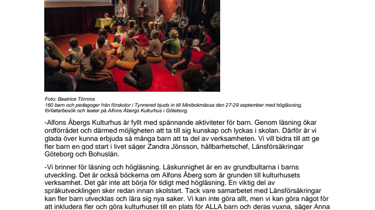 Länsförsäkringar Göteborg och Bohuslän och Alfons Åbergs Kulturhus samverkar i en läsfrämjande satsning. 160 barn och pedagoger från förskolor i Tynnered bjuds in till Minibokmässa den 27-29 september med högläsning, författarbesök och teater på Alfons Åbergs Kulturhus i Göteborg.