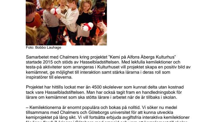 – Kemilektionerna är enormt populära och bokas på nolltid. Vi söker nu medel tillsammans med Chalmers och Göteborgs universitet för att kunna utveckla kemiprojektet på lång sikt. Vi vill fortsätta erbjuda avgiftsfria interaktiva kemilektioner för ännu fler 6-7 åringar i Göteborg med omnejd och vara ett komplement till skolan, säger Anna Forsgren, VD för Alfons Åbergs Kulturhus.