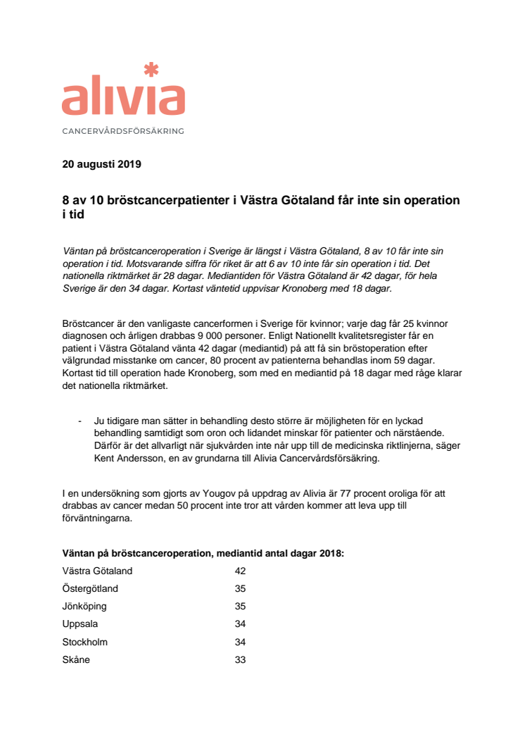 Väntan på bröstcanceroperation i Sverige är längst i Västra Götaland, 8 av 10 får inte sin operation i tid. Motsvarande siffra för riket är att 6 av 10 inte får sin operation i tid. Det nationella riktmärket är 28 dagar. Mediantiden för Västra Götaland är 42 dagar, för hela Sverige är den 34 dagar. Kortast väntetid uppvisar Kronoberg med 18 dagar.
