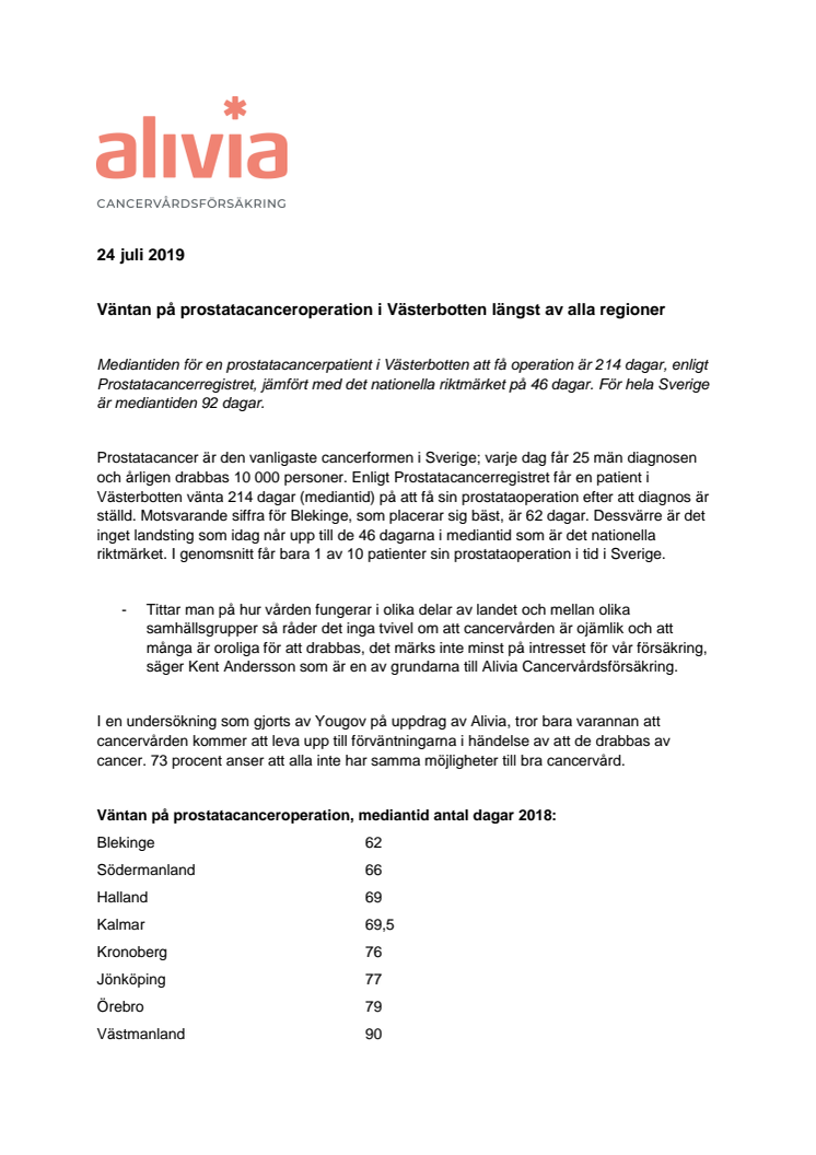 Mediantiden för en prostatacancerpatient i Västerbotten att få operation är 214 dagar, enligt Prostatacancerregistret, jämfört med det nationella riktmärket på 46 dagar. För hela Sverige är mediantiden 92 dagar.