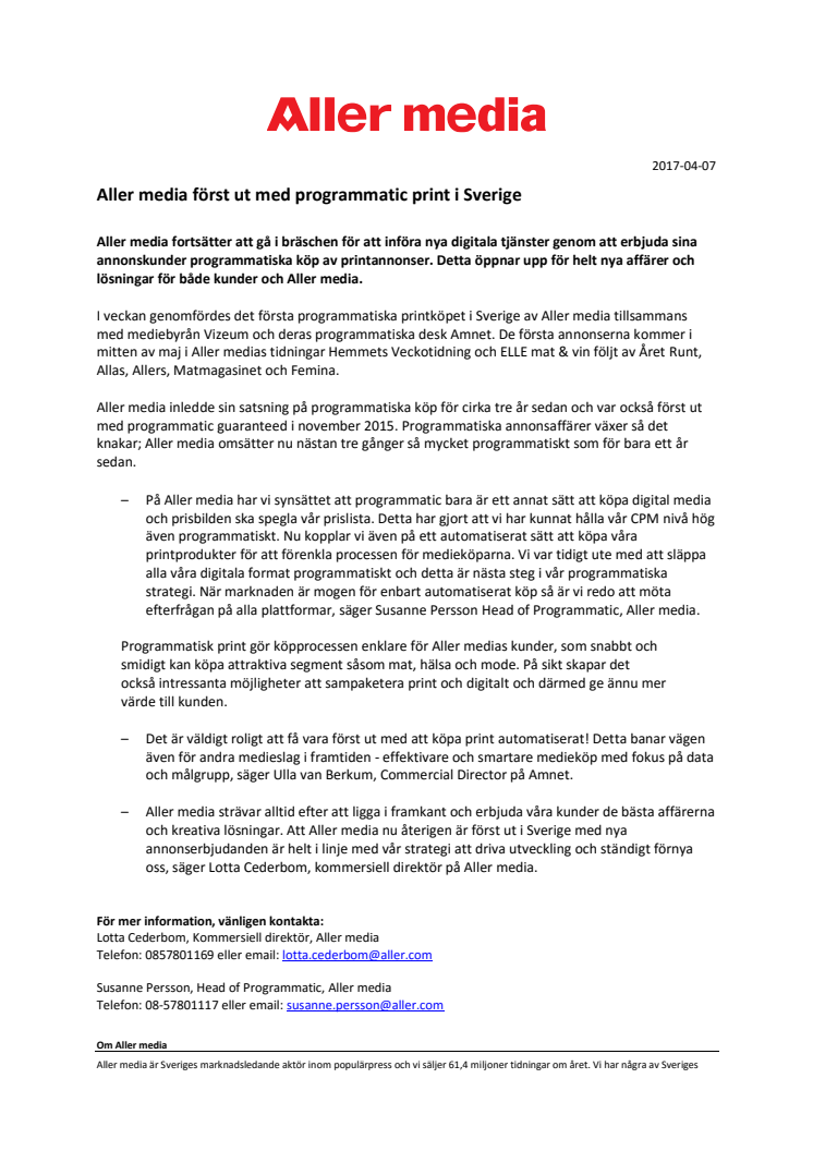 Aller media fortsätter att gå i bräschen för att införa nya digitala tjänster genom att erbjuda sina annonskunder programmatiska köp av printannonser. Detta öppnar upp för helt nya affärer och lösningar för både kunder och Aller media.