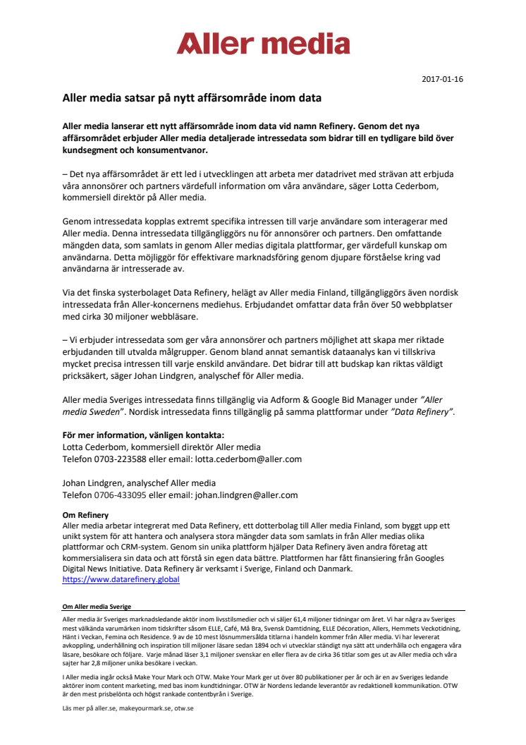 Aller media lanserar ett nytt affärsområde inom data vid namn Refinery. Genom det nya affärsområdet erbjuder Aller media detaljerade intressedata som bidrar till en tydligare bild över kundsegment och konsumentvanor.