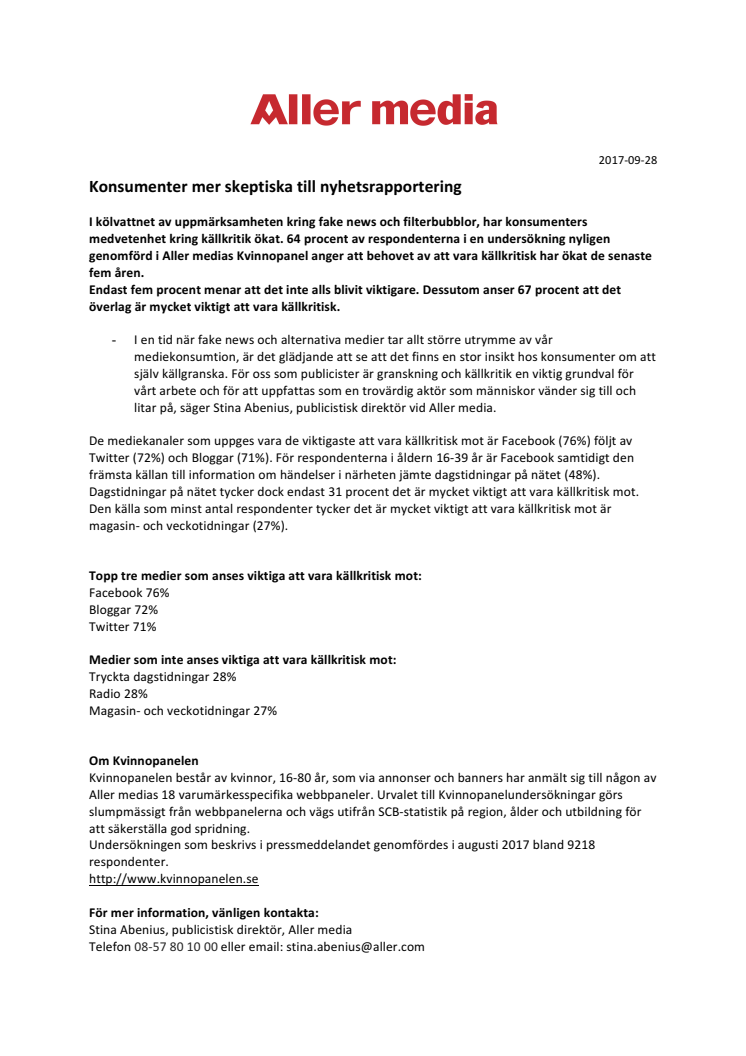 I kölvattnet av uppmärksamheten kring fake news och filterbubblor, har konsumenters medvetenhet kring källkritik ökat. 64 procent av respondenterna i en undersökning nyligen genomförd i Aller medias Kvinnopanel anger att behovet av att vara källkritisk har ökat de senaste fem åren.