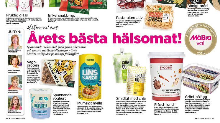 – Det är fantastiskt hur utbudet av nyttiga och gröna matprodukter har ökat i vanliga affärer de senaste åren. Det har varit en glädje att välja ut våra favoriter detta år och ge dem utmärkelsen ”MåBra-val 2018”. Förutom att de har tydliga hälsofördelar är produkterna väldigt goda och passar utmärkt för den som vill äta vegetariskt och lättlagat, säger MåBra:s chefredaktör Liselotte Stålberg, som suttit med i juryn.