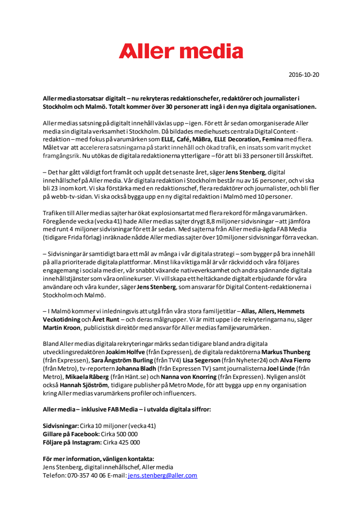 – Sidvisningar är samtidigt bara ett mål av många i vår digitala strategi – som bygger på bra innehåll på alla prioriterade digitala plattformar. Minst lika viktiga mål är vår räckvidd och våra följares engagemang i sociala medier, vår snabbt växande nativeverksamhet och andra spännande digitala innehållstjänster som våra onlinekurser. Vi vill skapa ett heltäckande digitalt erbjudande för våra användare och våra kunder, säger Jens Stenberg, som ansvarar för Digital Content-redaktionerna i Stockholm och Malmö.