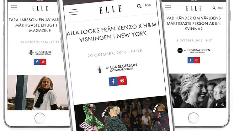 – Precis som i print är mode, beauty och populärkultur centrala ämnen för ELLE online, säger Lisa Arnell, sajtansvarig digital redaktör. Men vi vill hela tiden utveckla hur vi bäst tar oss an dessa områden digitalt, mobilt och socialt. Vi har också ökat vår räckvidd i sociala medier extremt snabbt. Sedan några veckor är ELLE den svenska modesajt som har flest gillare på Facebook, över 45 000, och på Instagram närmar vi oss 70 000 följare.