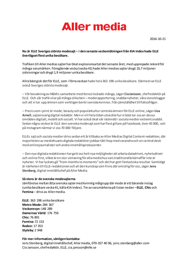 (unika besökare vecka 41, källa KIA Index). Tre av varumärkena på listan nedan – ELLE, Chic och Femina – drivs av Aller media.