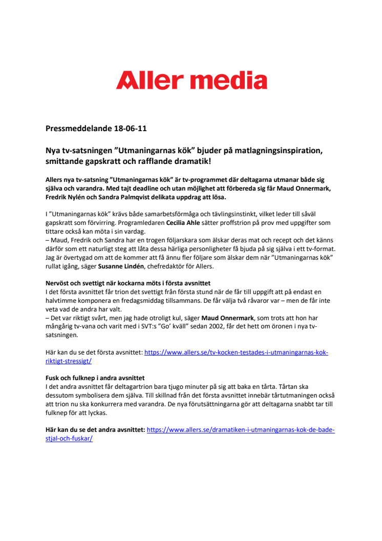 – Maud, Fredrik och Sandra har en trogen följarskara som älskar deras mat och recept och det känns därför som ett naturligt steg att låta dessa härliga personligheter få bjuda på sig själva i ett tv-format. Jag är övertygad om att de kommer att få ännu fler följare som älskar dem när ”Utmaningarnas kök” rullat igång, säger Susanne Lindén, chefredaktör för Allers.