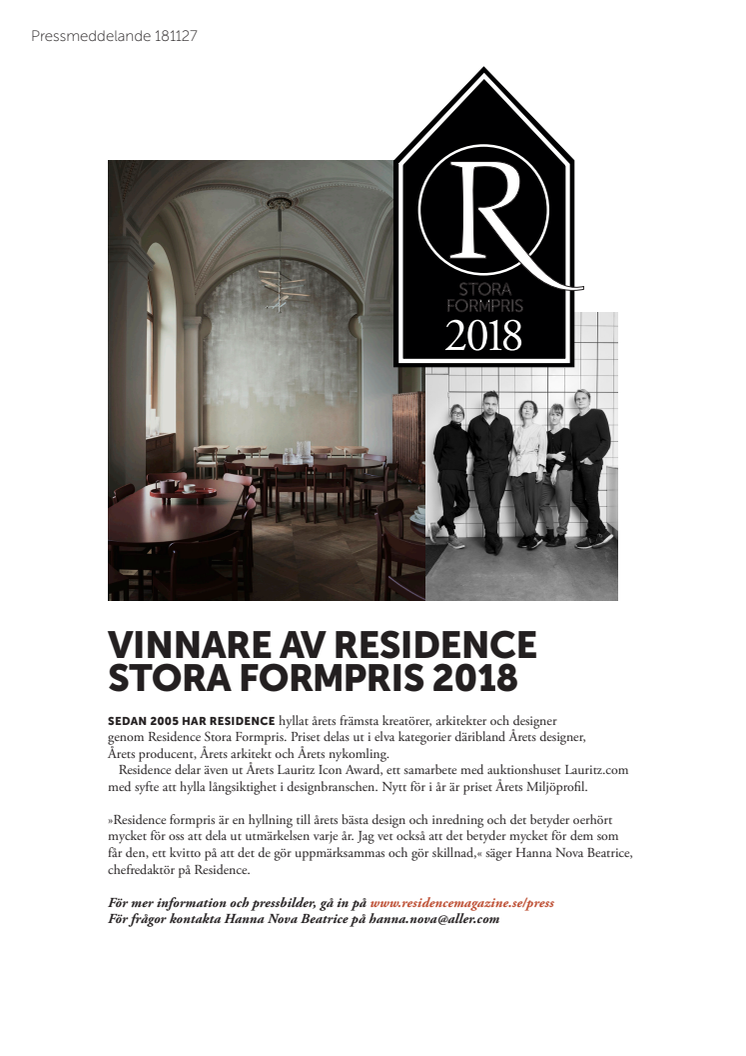 VINNARE AV RESIDENCE STORA FORMPRIS 2018