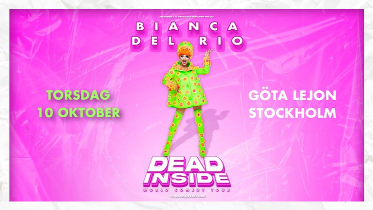 Comedydrottningen och RuPaul's Drag Race-champion Bianca Del Rio återvänder till Sverige med sin hyllade standupshow "Dead Inside", som en del av hennes storskaliga turné över Storbritannien och Europa. Showen äger rum på Göta Lejon den 10 oktober 2024.