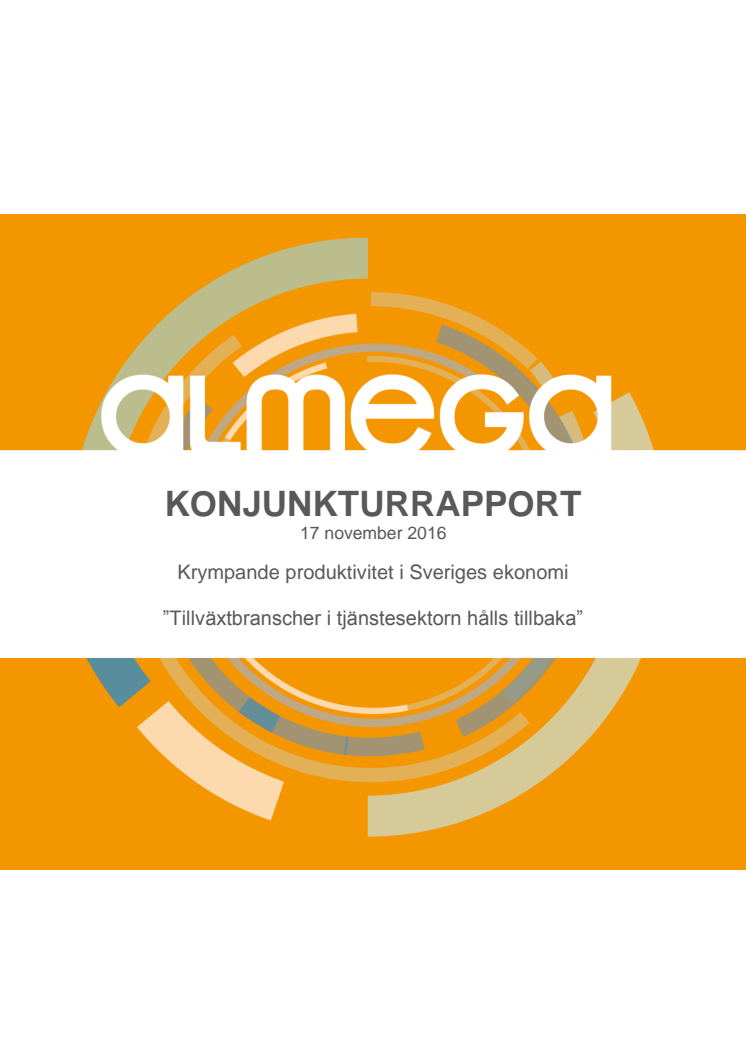 Efter den höga BNP-tillväxten i Sveriges ekonomi under förra året, 4,1 procent, räknar Almega, i sin Konjunkturrapport för hösten 2016, med en gradvis inbromsning. Tillväxten beräknas i år bli 3,1 procent och 1,9 procent nästa år. Bakom inbromsningen ligger dels en historiskt svag världshandel, som inte enbart beror på svag efterfrågan utan även på en strukturell förändring.