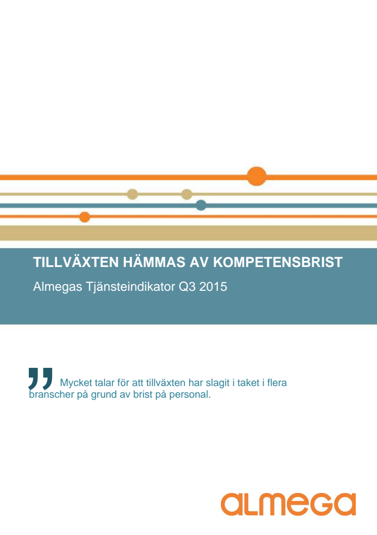 Almegas tjänsteindikator pekar på att tillväxten inom privat tjänstesektor ökar i ungefär samma takt under tredje, som under andra kvartalet 2015. Då ökade tjänsteproduktionen med 2,1 procent. Efterfrågan på tjänster riktade till hushåll och företag ser fortsatt stark ut, men kapacitetsutnyttjandet är redan högt inom flera branscher.