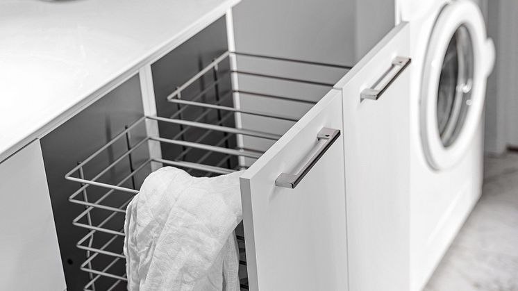 Den utdragbara tvättkorgen är inbyggd med diskret placering i underskåp från Isellaserien, och den trådade tvättkorgen gömmer på ett smidigt sätt undan smutstvätten, utan att ta någon golvyta i anspråk.