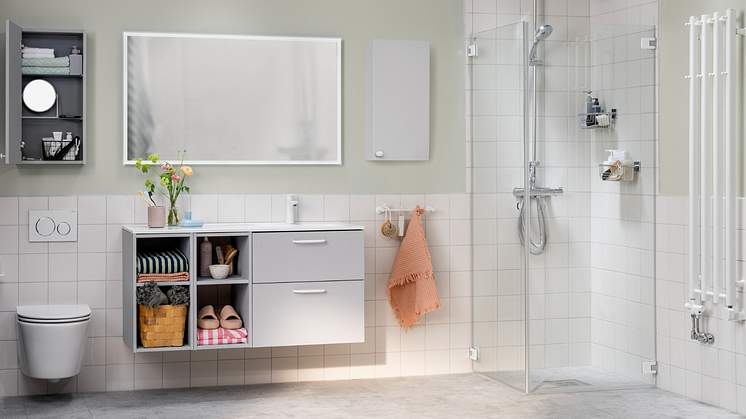 Det öppna skåpet lämpar sig perfekt för badrumsprylar som används ofta, och som samtidigt tål att visas upp. Med den öppna lösningen blir det både lätt att komma åt sakerna, och att se vad som finns var, samtidigt som badrummet får en luftig känsla. Skåpet består av ett eller två öppna skåp och två mjukstängande lådor, och erbjuder därför även dold förvaring för sådant man inte vill ha framme.