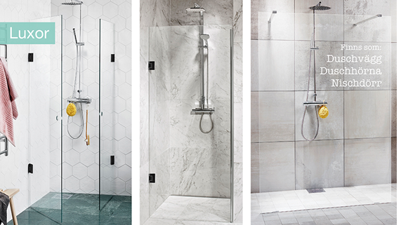 Duschväggen Luxor finns i flera varianter: som hörn, enkelförpackade nischdörrar och som skärmvägg. Alla går att få i en mängd olika mått för skräddarsydda lösningar. De 1 980 mm höga dörrarna är dessutom vändbara, för ökad valfrihet.