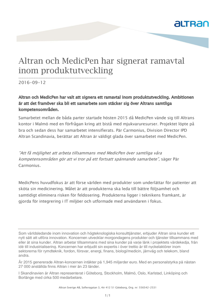 Altran och MedicPen har valt att signera ett ramavtal inom produktutveckling. Ambitionen är att det framöver ska bli ett samarbete som stäcker sig över Altrans samtliga kompetensområden. Samarbetet mellan de båda parter startade hösten 2015 då MedicPen vände sig till Altrans kontor i Malmö med en förfrågan kring att bistå med mjukvaruresurser.
