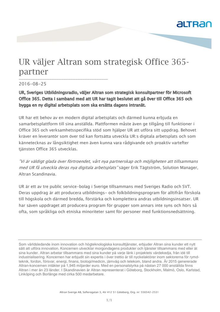 UR, Sveriges Utbildningsradio, väljer Altran som strategisk konsultpartner för Microsoft Office 365. Detta i samband med att UR har tagit beslutet att gå över till Office 365 och bygga en ny digital arbetsplats som ska ersätta dagens intranät.
