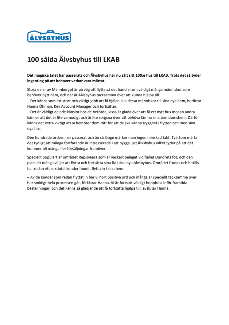100 sålda Älvsbyhus till LKAB