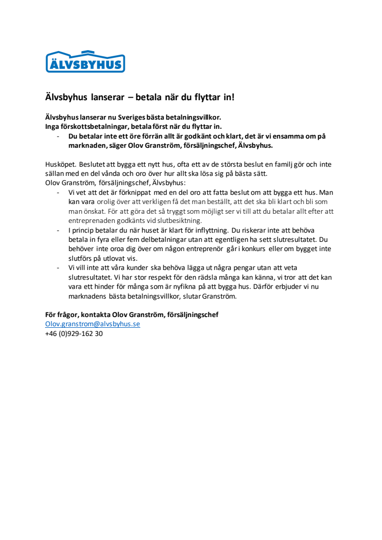 Älvsbyhus lanserar nu Sveriges bästa betalningsvillkor.
