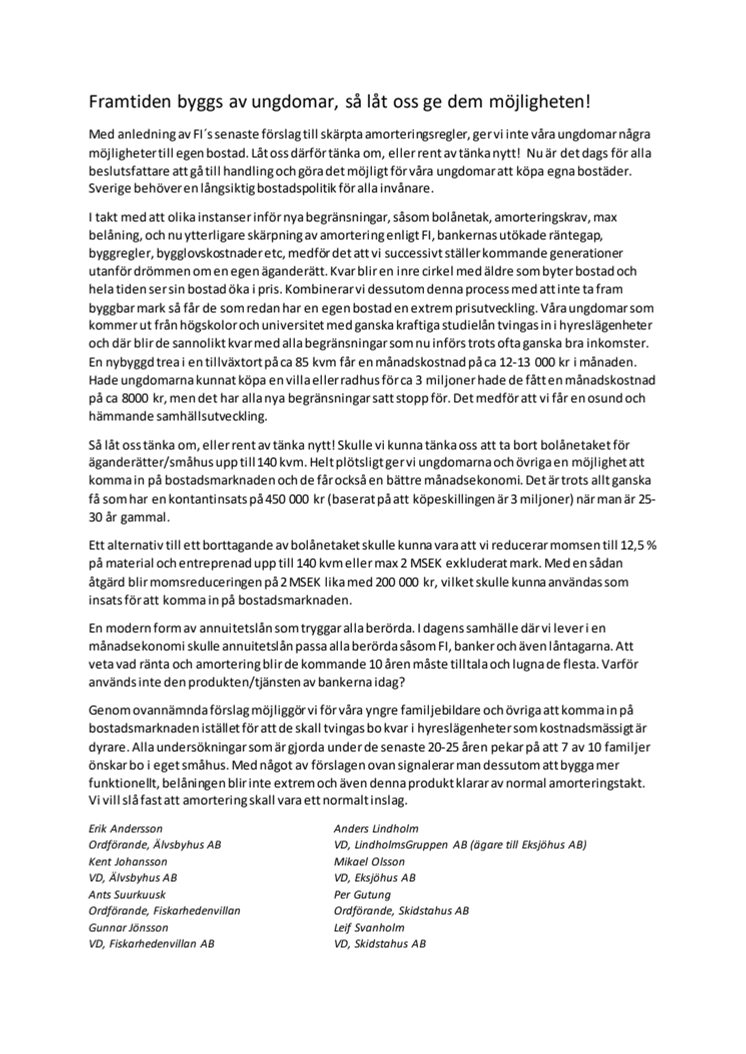 Med anledning av FI´s senaste förslag till skärpta amorteringsregler, ger vi inte våra ungdomar några möjligheter till egen bostad. Låt oss därför tänka om, eller rent av tänka nytt! Nu är det dags för alla beslutsfattare att gå till handling och göra det möjligt för våra ungdomar att köpa egna bostäder. Sverige behöver en långsiktig bostadspolitik för alla invånare.