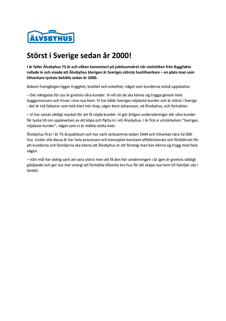 I år fyller Älvsbyhus 75 år och vilken kanonstart på jubileumsåret när statistiken från Byggfakta rullade in och visade att Älvsbyhus återigen är Sveriges största hustillverkare – en plats man som tillverkare lyckats behålla sedan år 2000.