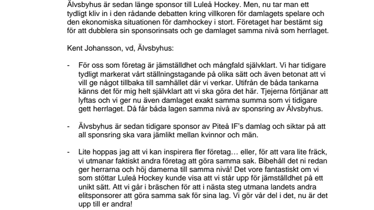 Älvsbyhus är sedan länge sponsor till Luleå Hockey. Men, nu tar man ett tydligt kliv in i den rådande debatten kring villkoren för damlagets spelare och den ekonomiska situationen för damhockey i stort. Företaget har bestämt sig för att dubblera sin sponsorinsats och ge damlaget samma nivå som herrlaget.