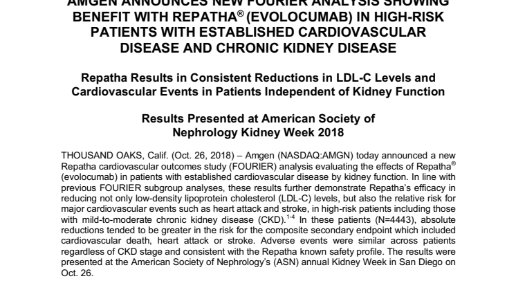 Repatha (evolocumab) sänker kraftfullt LDL-kolesterolet hos patienter med lätt till måttlig kronisk njursvikt, och minskar därmed risken för hjärtinfarkt och stroke. Det visar resultaten av en subgruppsanalys som i helgen presenterats på American Society of Nephrology ́s (ASN) årliga njurvecka, i San Diego, USA.