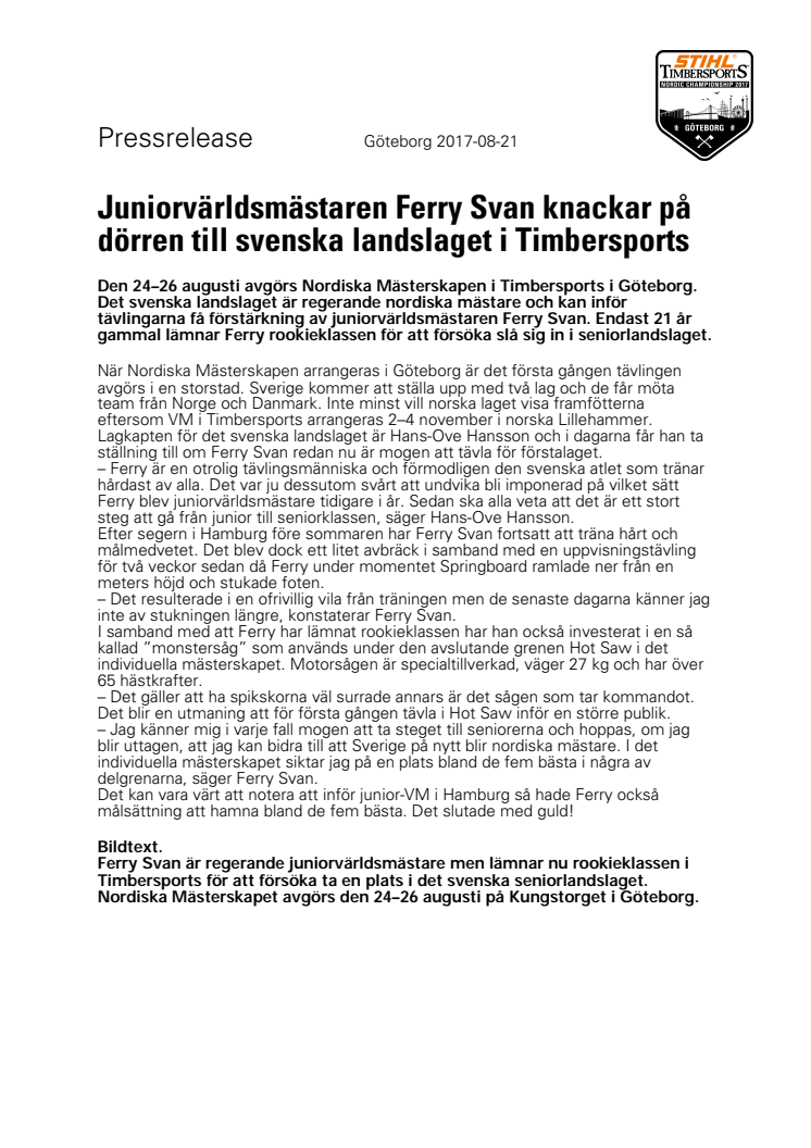 Den 24–26 augusti avgörs Nordiska Mästerskapen i Timbersports i Göteborg. Det svenska landslaget är regerande nordiska mästare och kan inför tävlingarna få förstärkning av juniorvärldsmästaren Ferry Svan. Endast 21 år gammal lämnar Ferry rookieklassen för att försöka slå sig in i seniorlandslaget.