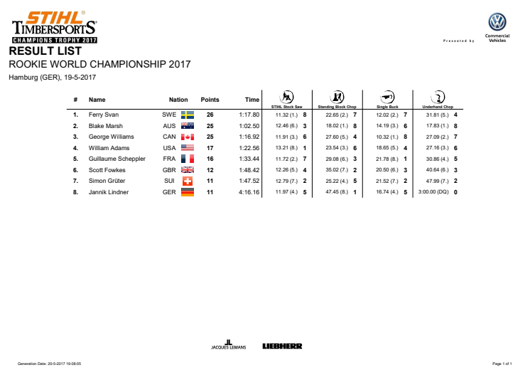 Hela resultatlistan från helgens junior VM i Timbersports där svenske Ferry Svan stod som slutsegrare, gren för gren.