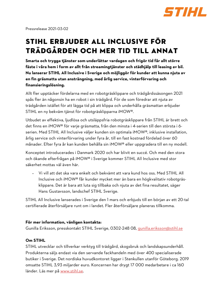 Smarta och trygga tjänster som underlättar vardagen och frigör tid får allt större fäste i våra hem i form av allt från streamingtjänster och städhjälp till leasing av bil. Nu lanserar STIHL All Inclusive i Sverige och möjliggör för kunder att kunna njuta av en fin gräsmatta utan ansträngning, med årlig service, vinterförvaring och finansieringslösning.