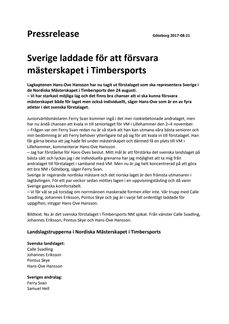 Lagkaptenen Hans-Ove Hansson har nu tagit ut förstalaget som ska representera Sverige i de Nordiska Mästerskapet i Timbersports den 24 augusti.
